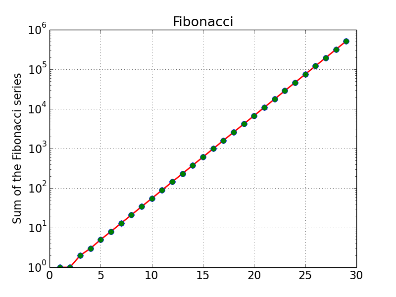 Rewrite the function fib(n) such that the sum of the series is stored in a variable (numpy array). Plot the first 30 first values in the variable with logarithmic y-axis. Make the plot presentable.