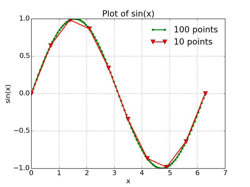 d) Plot \( sin(x) \) from \( x=0 \) to \( x=2\pi \) with 10 and 100 points. Make the figure presentable by naming the axes, set different colors to the lines, including legend etc. Save the figure as a file.