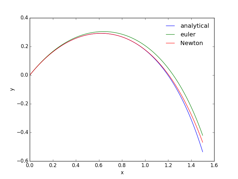 Solve Eq. \eqref{eq:newton} using Euler's method. Plot and compare with Newton's solution Eq. \eqref{eq:newton_approx} and the analytical solution Eq. \eqref{eq:newton_analytical}. Plot between \( x=0 \) and \( x=1.5 \)